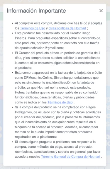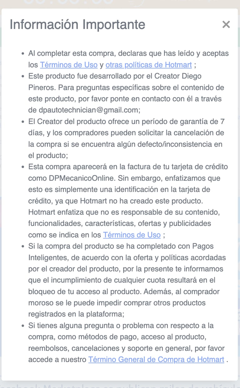 Información importante sobre compras en Hotmart: conoce los términos de uso, políticas de reembolso, garantía de 7 días, facturación y soporte al cliente para productos de DP Mecánico Online.Escribe tu texto aquí...